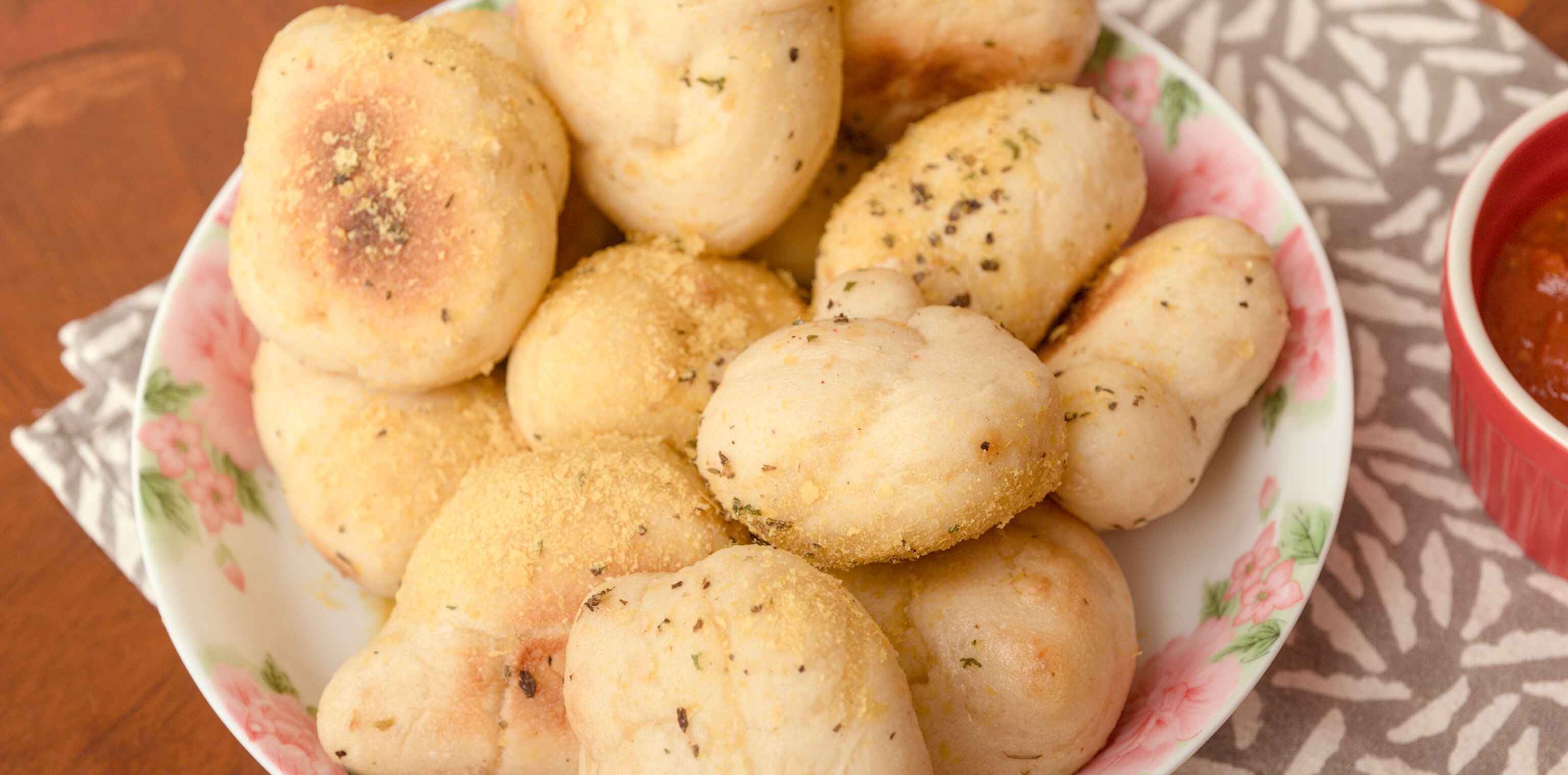 8. Place the knots in the medium mixing bowl, pour the butter over them, and toss them until they're covered. Plate them, sprinkle them with nutritional yeast and a pinch of salt, and serve them with the marinara sauce.